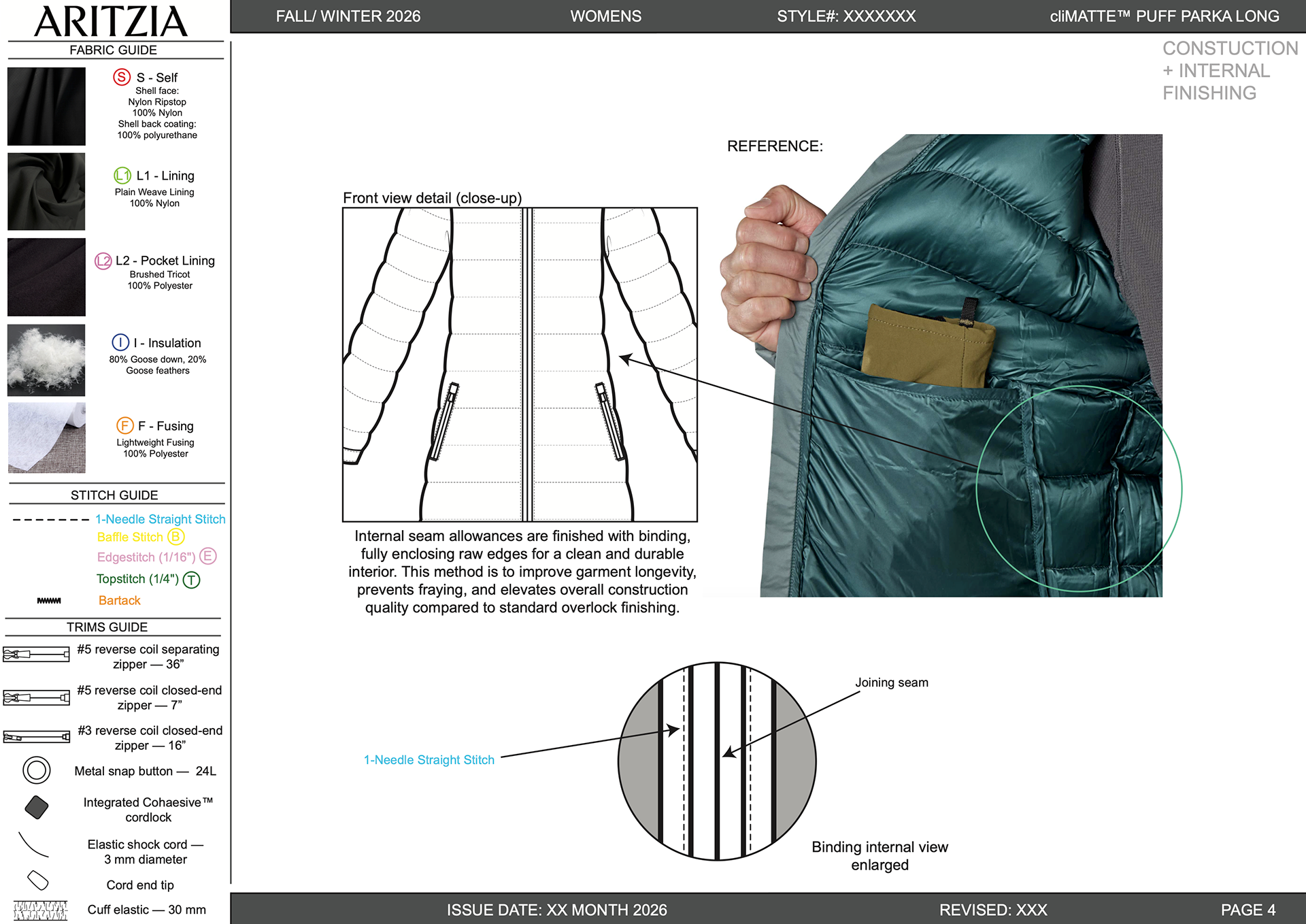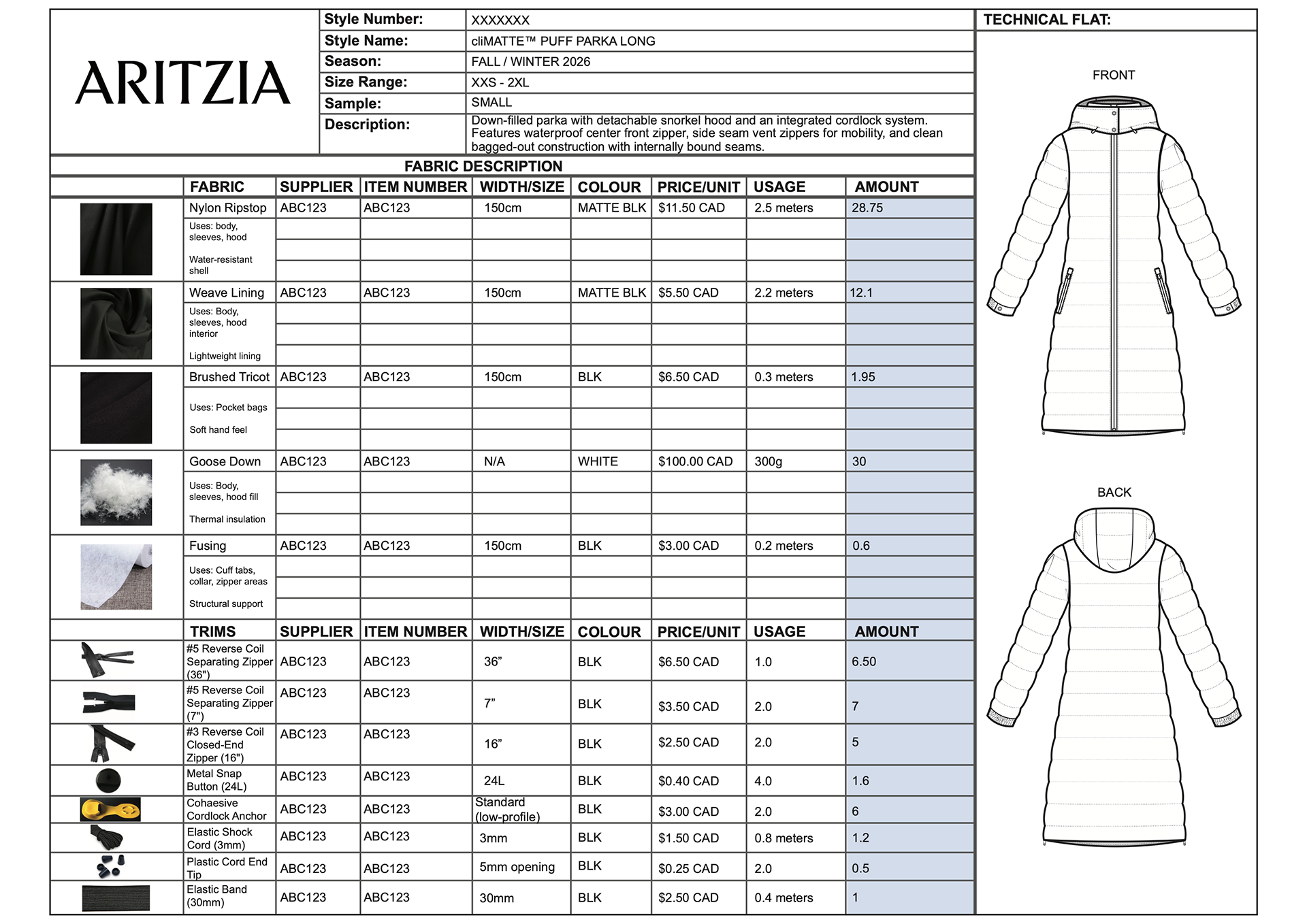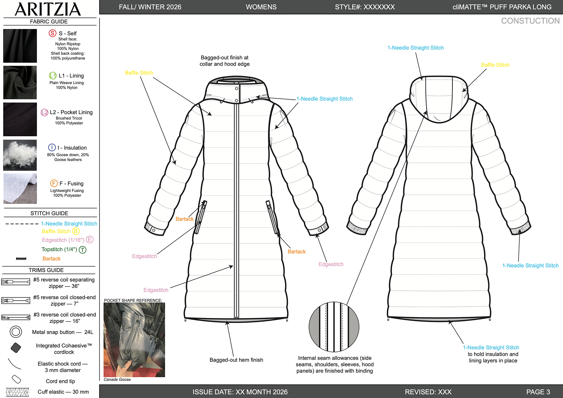 Completed as part of an assessment for Aritzia’s Technical Design department, this project involved developing a full tech pack for a performance-focused longline puffer jacket. The brief emphasized accurate construction, material selection, and clear communication of functional design elements. Deliverables included technical flats, stitch guides, and a comprehensive bill of materials with realistic sourcing and costing.